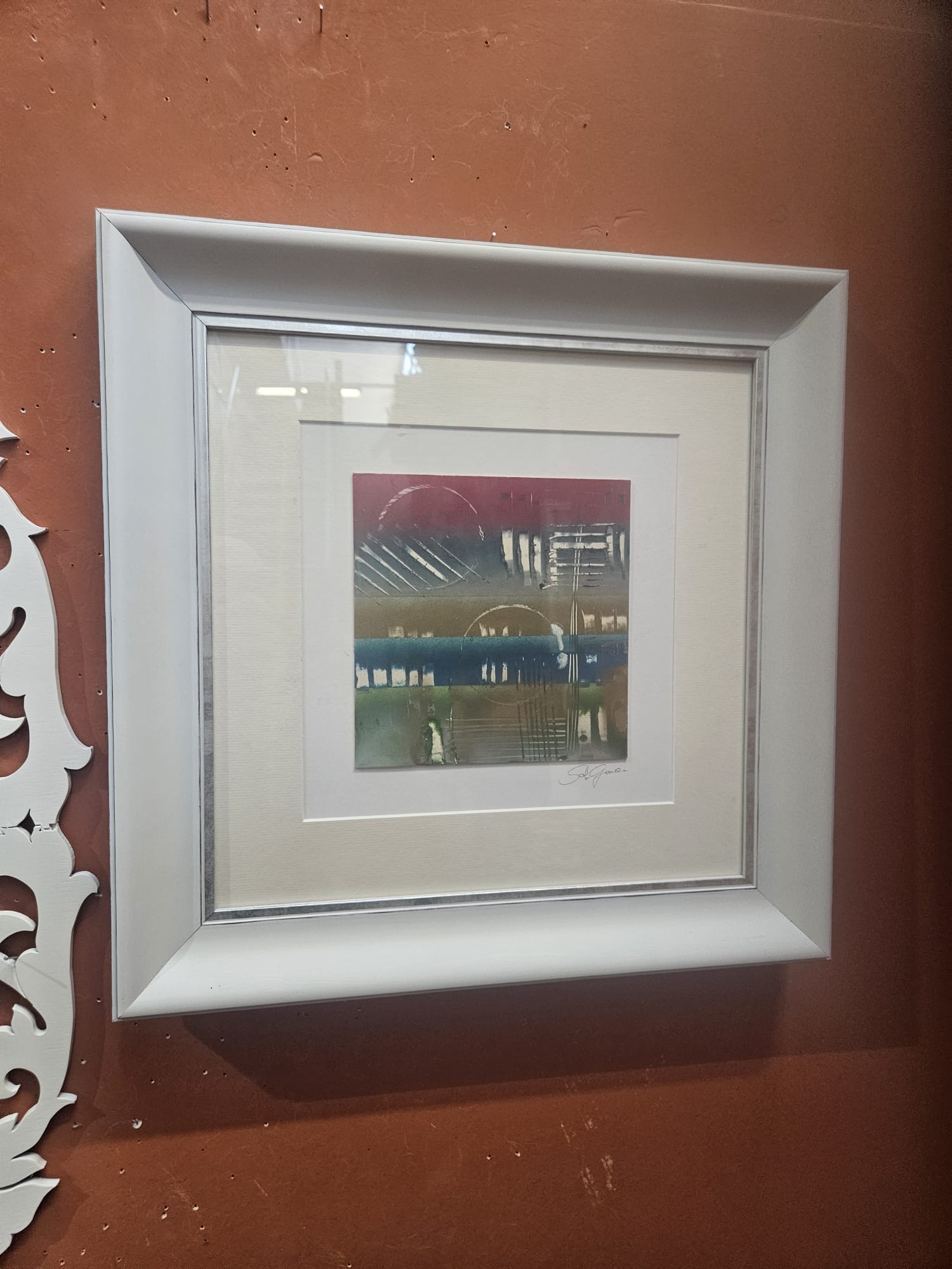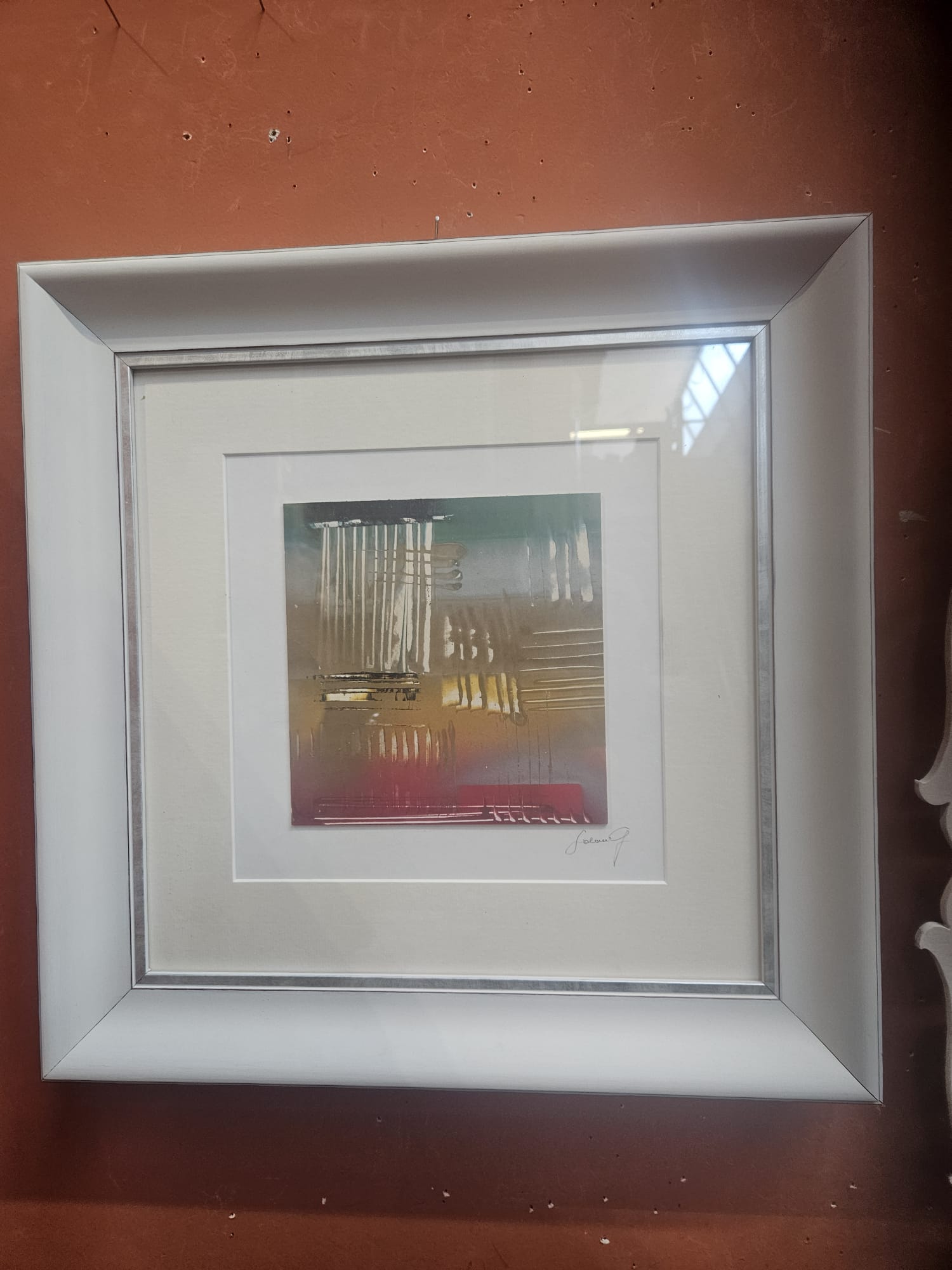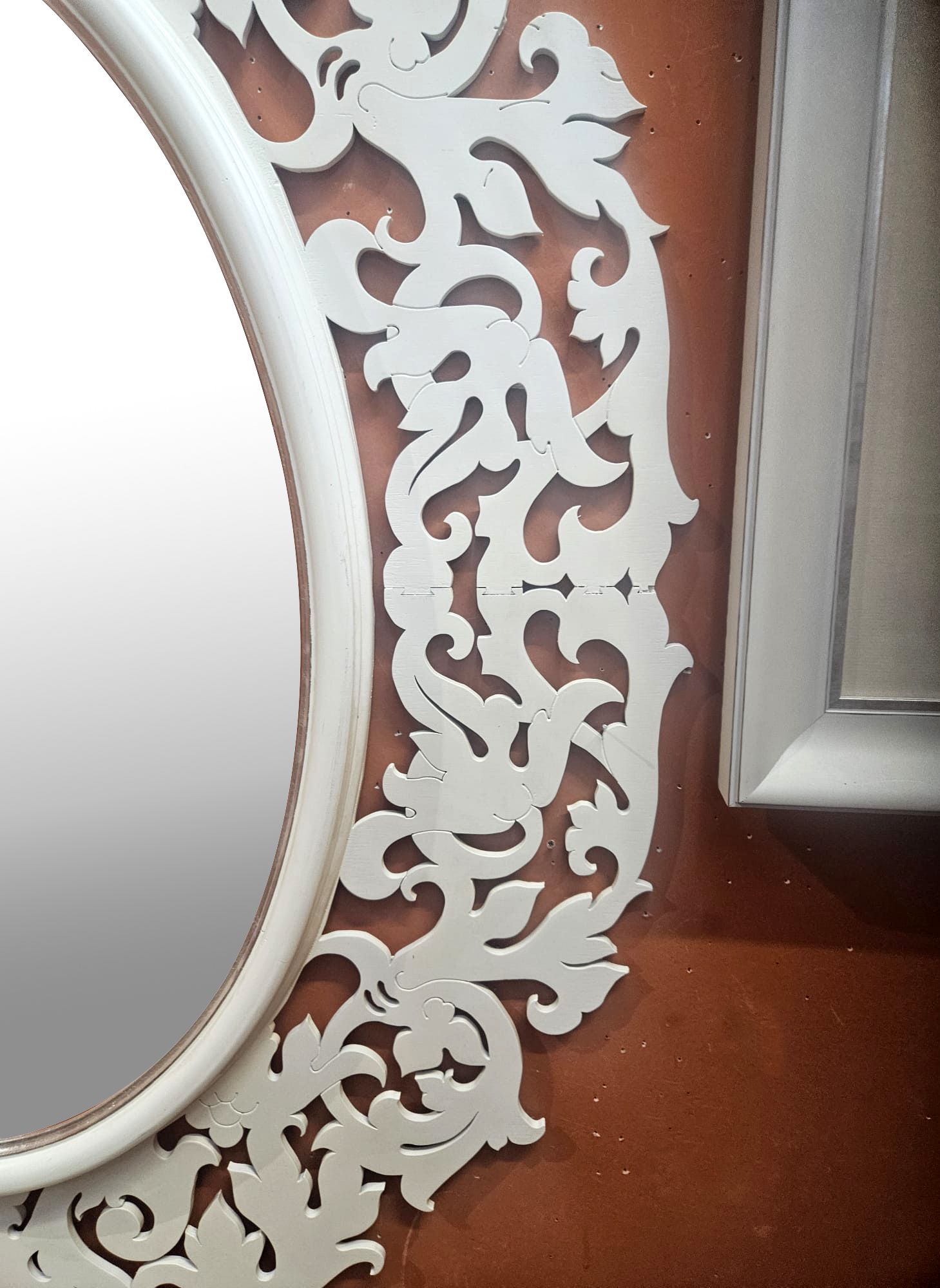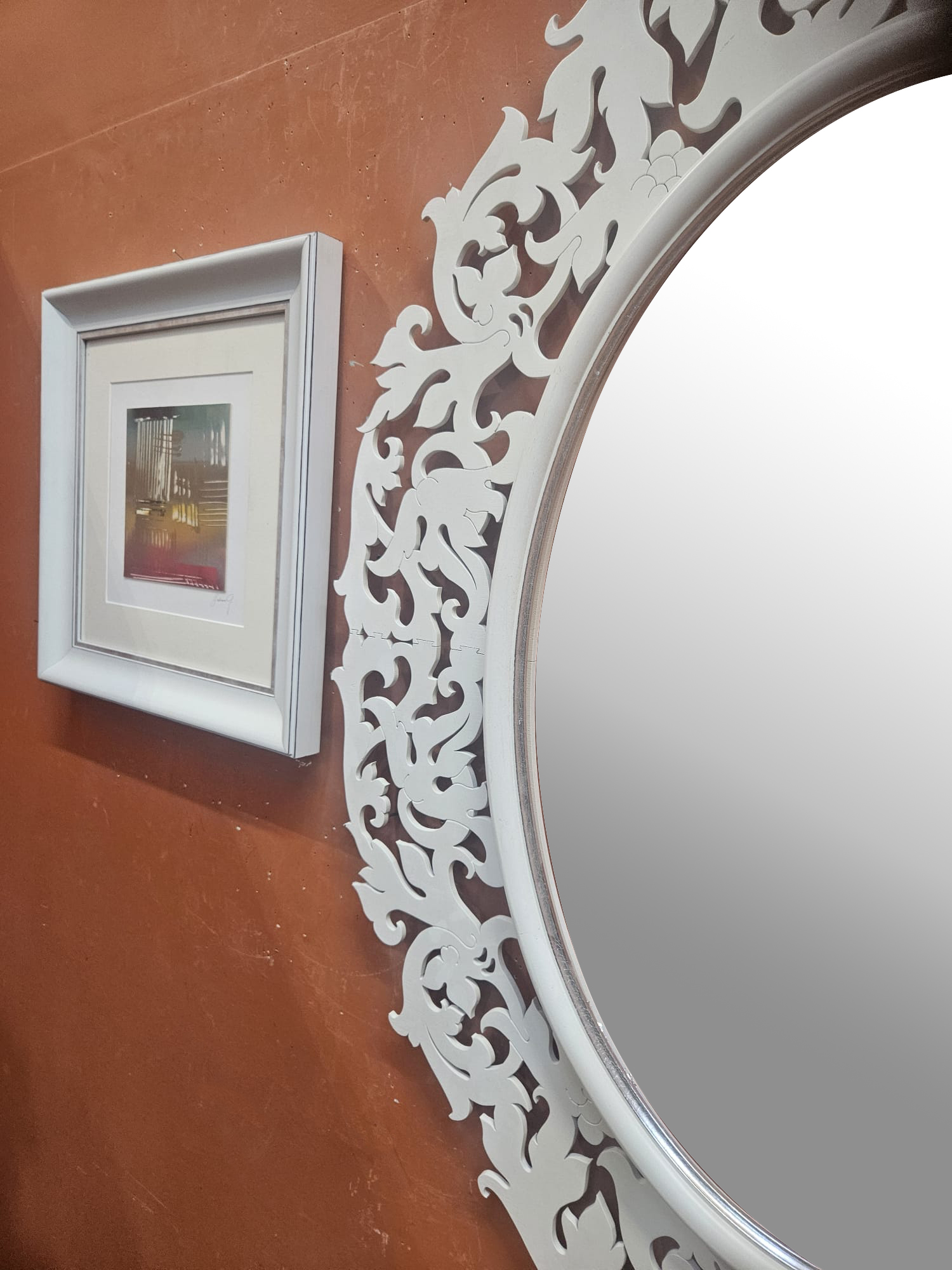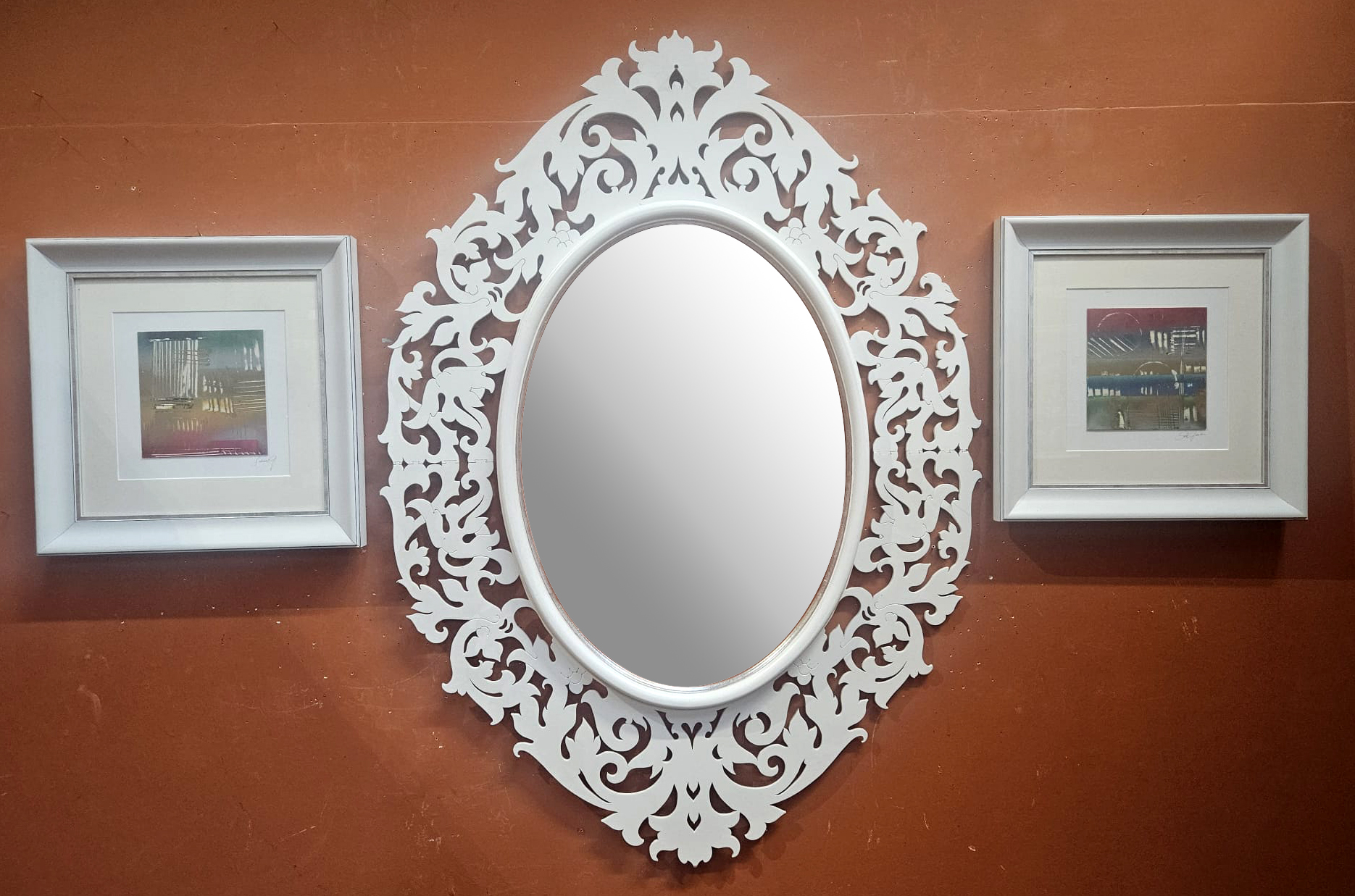 Completo da parete composto da specchiera in legno traforata colore panna cm 50×70 misura interna e cm 90×127 misura esterna, e da due quadretti di aerografi moderni i cornice bianca e argento.